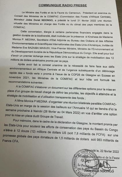 Le Ministre des forêts et de la faune du Cameroun, Président en Exercice de la Commission des Forêts d'Afrique Centrale(COMIFAC) Monsieur Jules Doret NDONGO, a présidé une réunion Virtuelle des Ministres en charge des Forêts ou du climat des pays membres de la COMIFAC le lundi 21 février 2022.