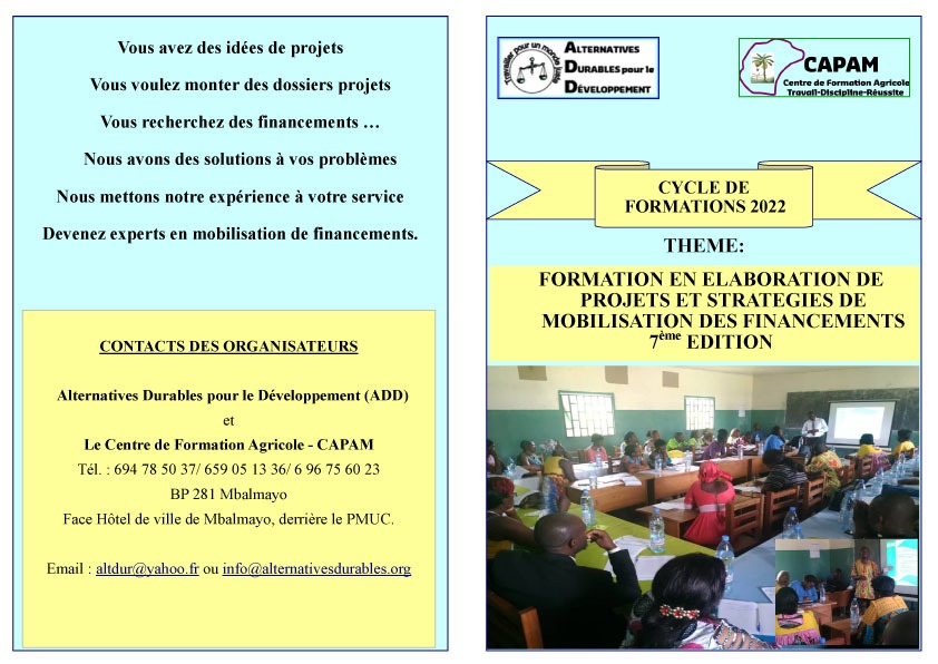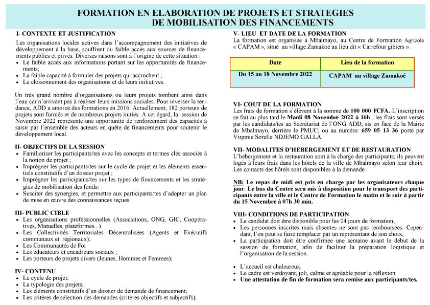 Un très grand nombre d'organisations ou leurs projets tombent ainsi dans l'eau car n'arrivant pas à réaliser leurs missions sociales. Pour inverser la tendance, ADD a amorcé des formations en 2016. Actuellement, 182 porteurs de projets sont formés et de nombreux projets initiés. A cet égard, la session de Novembre 2022 représente une opportunité de renforcement des capacités à saisir par l'ensemble des acteurs en quête de financements pour soutenir le développement local. La formation aura lieu 15 au 18 novembre 2022 au CAPAM au village Zamakoé.